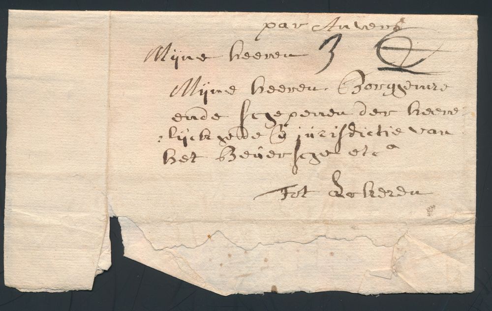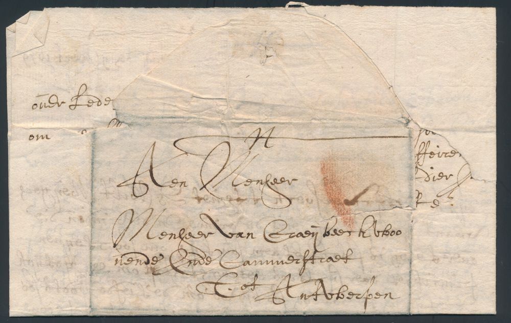 942 image1679 Forerunner with contents from Mechelen, dated 9 March 1679, to Antwerp, with postage indication red chalk line I, the letter has some damage, f(Image 1)