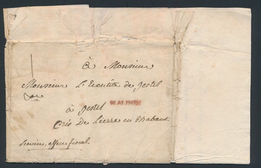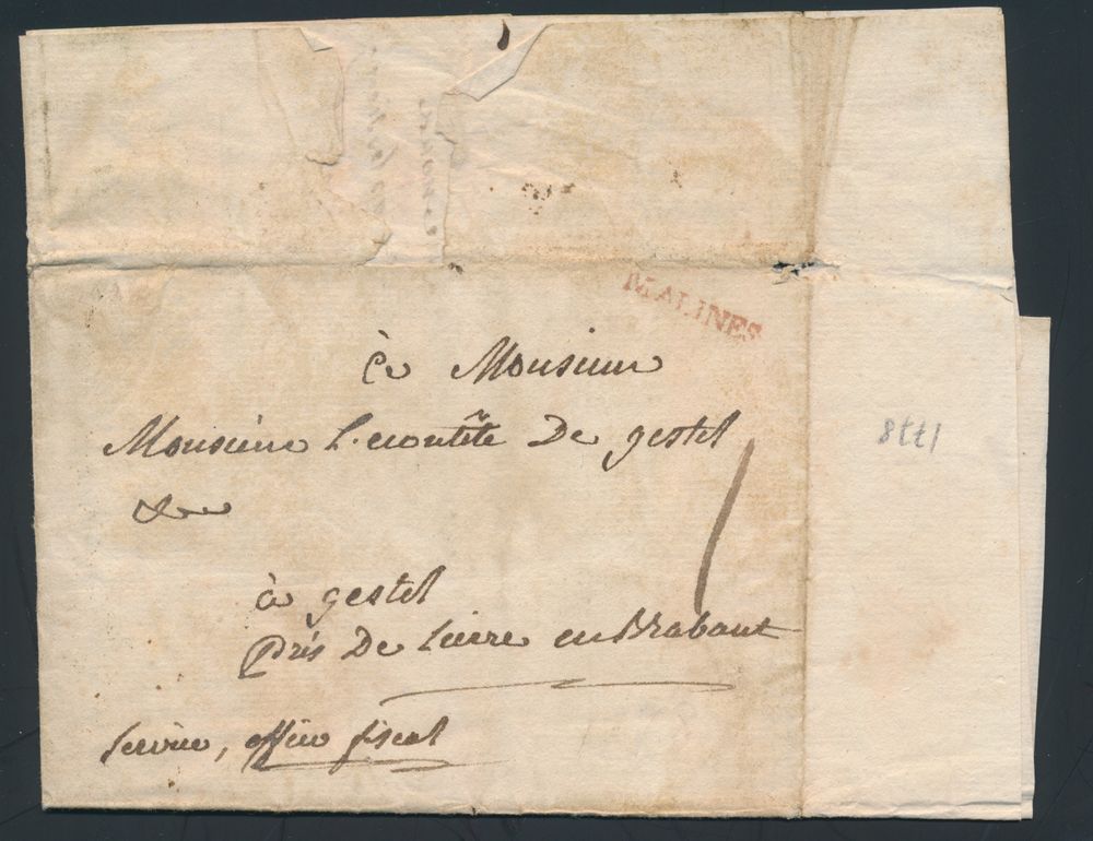 957 image1778 Forerunner with contents, from Mechelen, H14 (Malines in red - small), dated 23 October 1778, to Gestel, manuscript "Services, offices fiscal", charge I decimen, vf(Image 1)