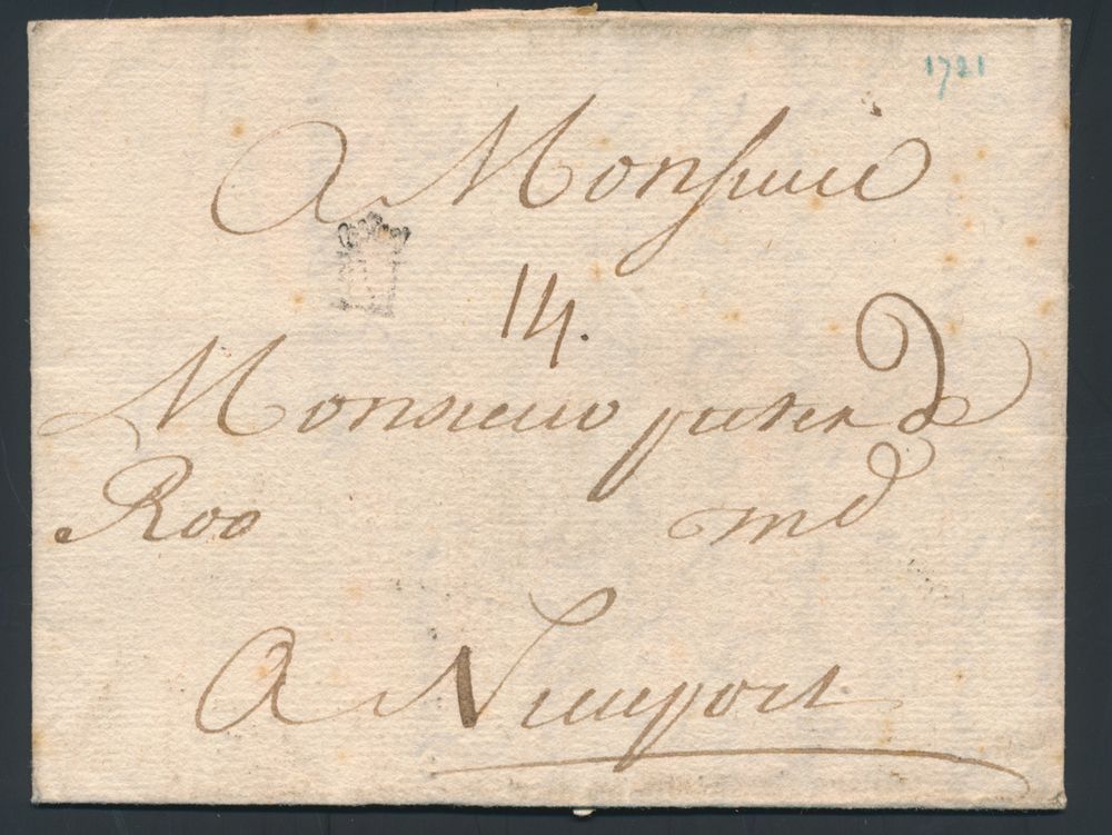 949 image1721 Forerunner with contents, from Namur, dated 27 February 1721, cancelled "N", not described in Herlant, to Nieuwpoort, vf(Image 1) (Image 2)