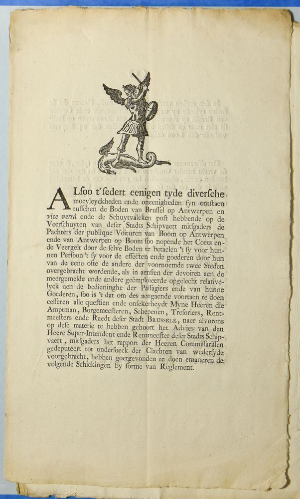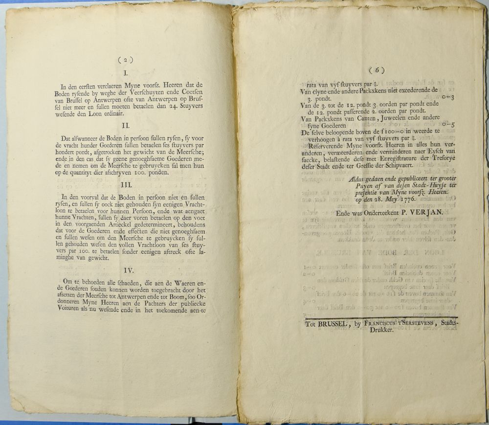 954 1776 Announcement in the city of Antwerp of the rates charged by bidders for delivering shipments between Antwerp and Brussels, dated 13 June 1776, from the meeting of 10 June 1776, very fine historical document for collectors of old documents and forerunners, unique, vf