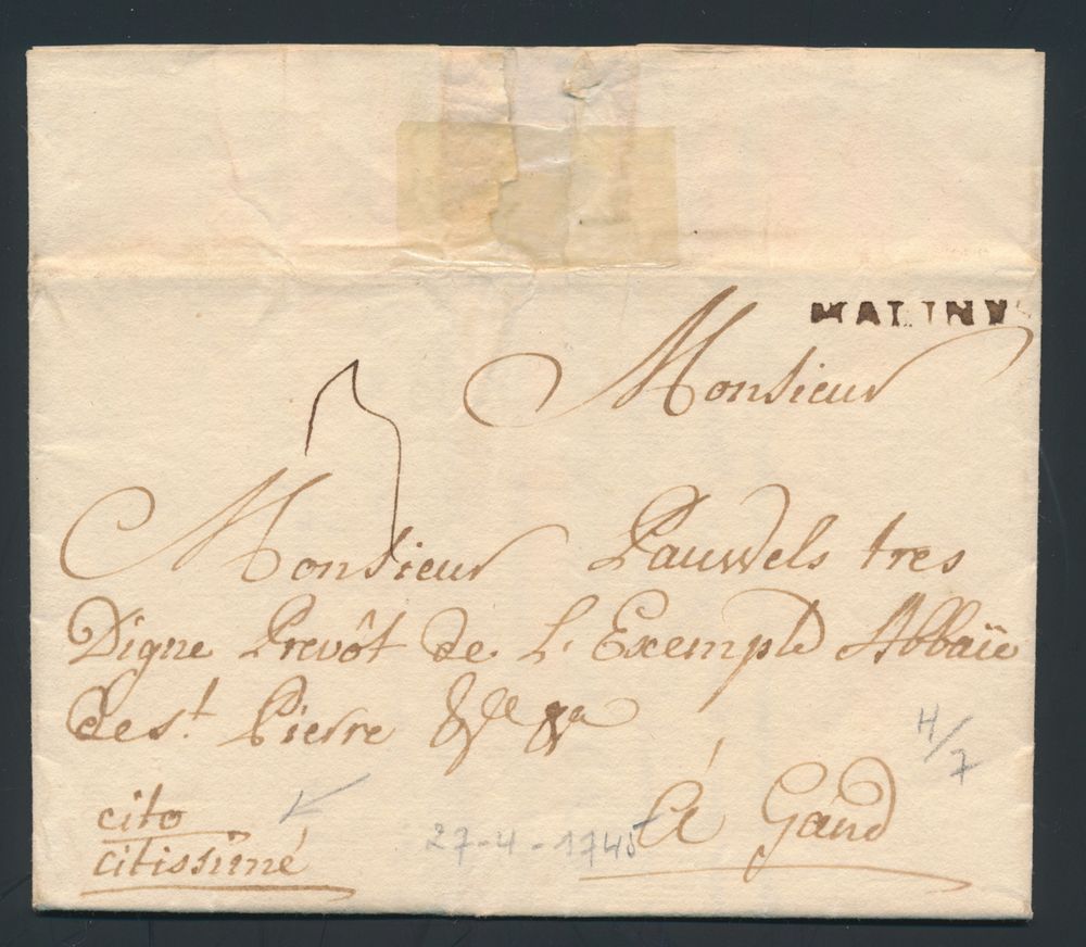 951 image1748 Forerunner with contents, from Mechelen, H8 (Malines in black), dated 27 April 1748, to Gand, charge 3 decimes, beautiful manuscript "Cito/CITISSIME", vf(Image 1)