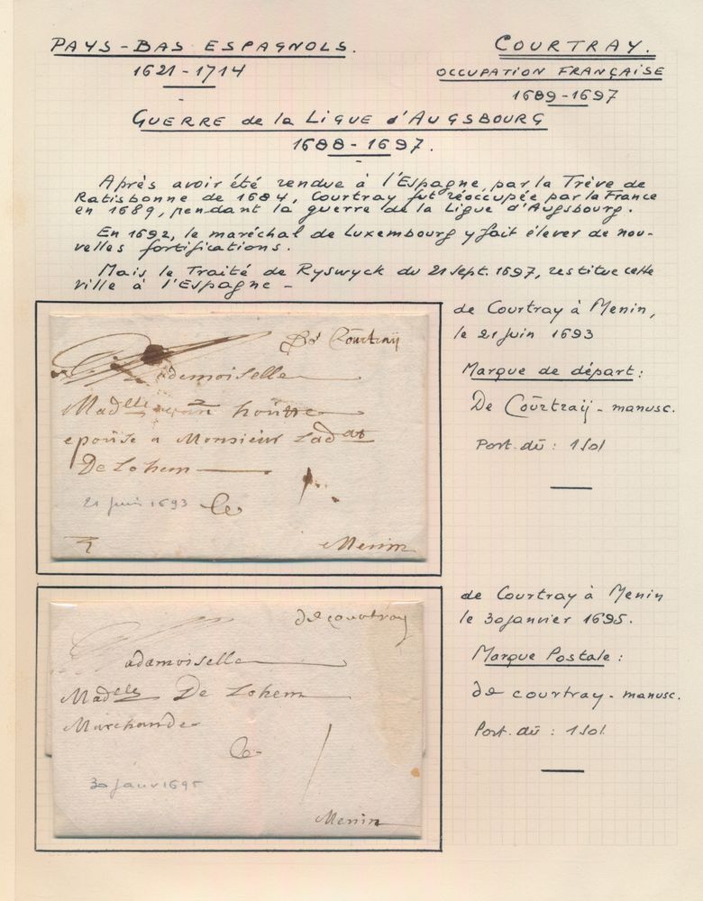 944 image1693 Forerunner from Kortrijk (H.1), dated 21 June 1693, to Menin and 1695, forerunner from Kortrijk (H. 3), dated 30 January 1695 to Menin, both documents in excellent condition, more information available with lot, see scan, vf(Image 1)