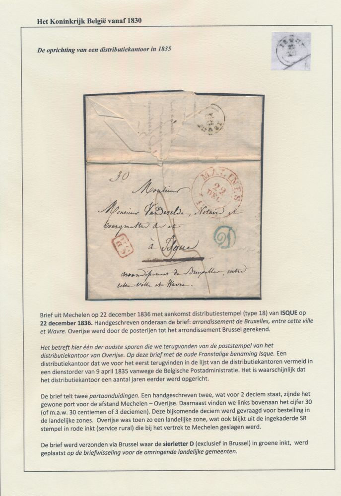 969 image1836 Forerunner from Mechelen, dated 22 December 1836, to Isque (Overijse), type 18 cancellation, office opened in 1835, very early cancel from this office, additional "green curled D" from Brussels for correspondence for the surrounding rural municipalities for checking the frankings (according to Herlant - with high rating), more info with the lot, vf(Image 1)