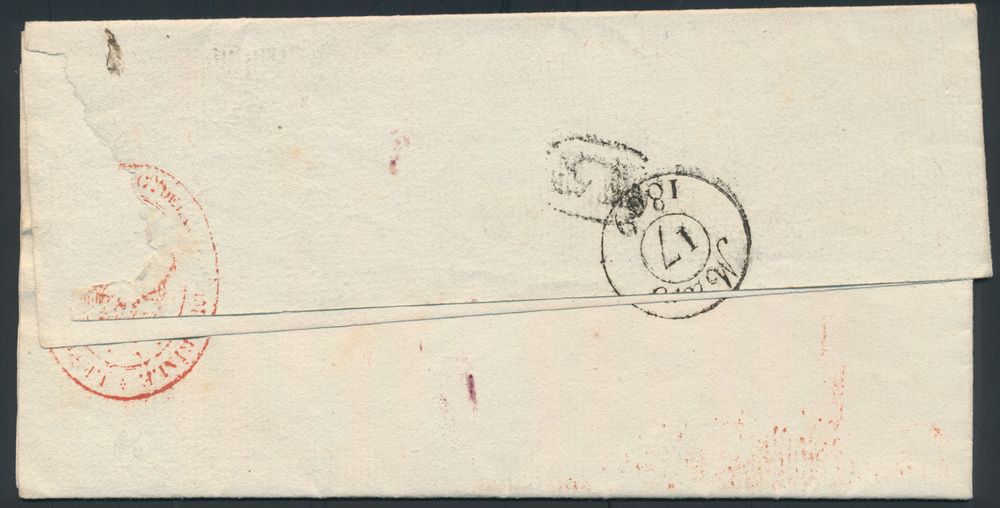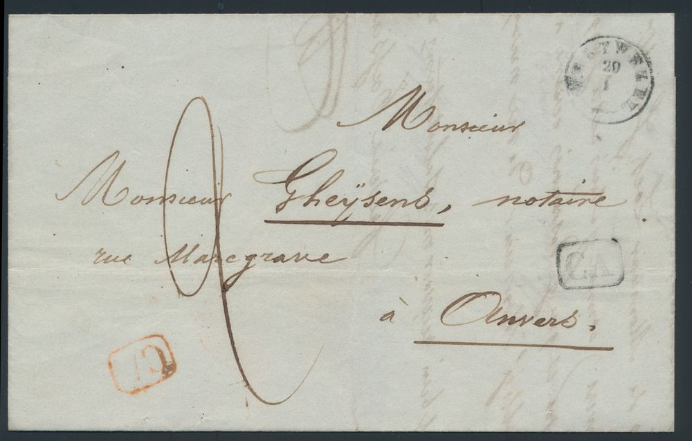 967 image1827 Forerunner, from Wustwezel, type 18 cancellation, dated 29 January, to Anvers, charge 2 decimes, beautiful "CA" (Correspondance arrandisement) in black and red (both in frame), vf(Image 1) (Image 2)