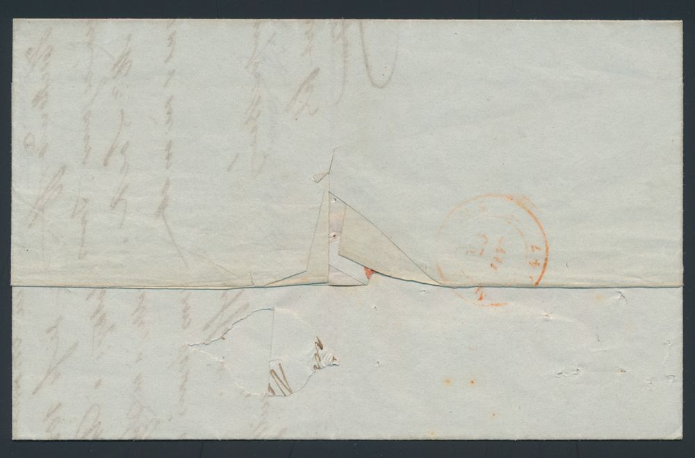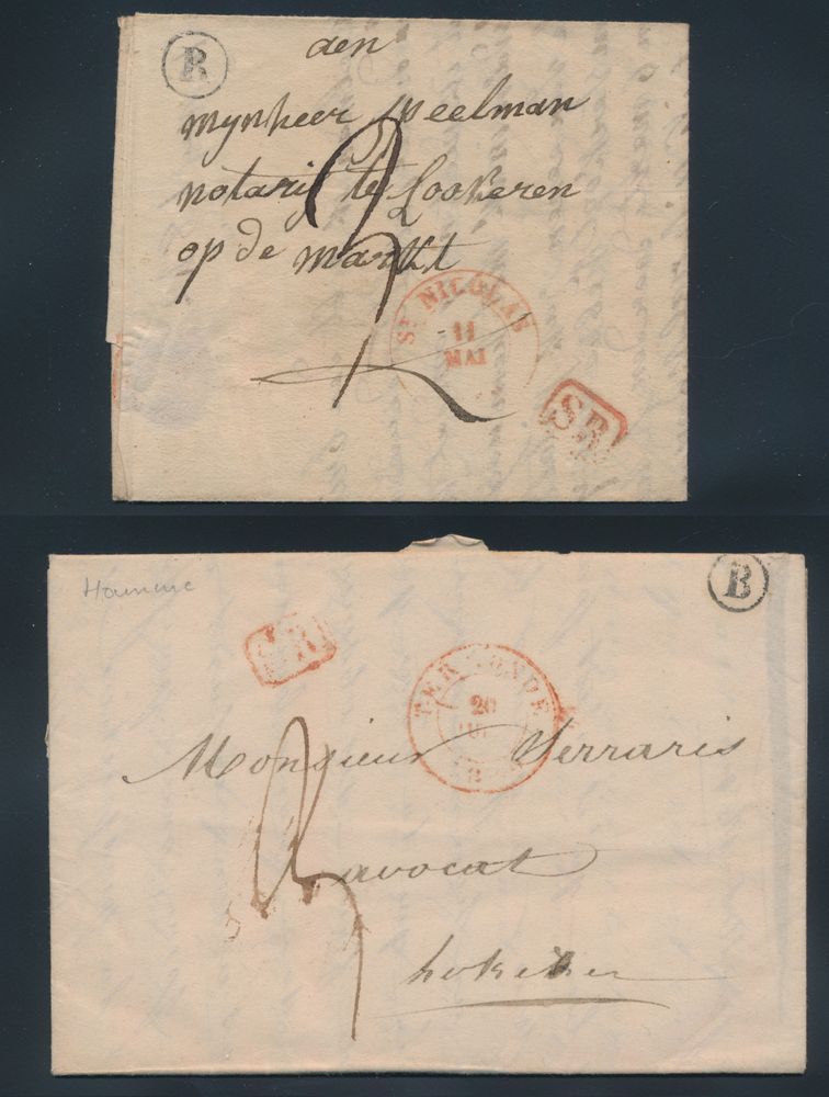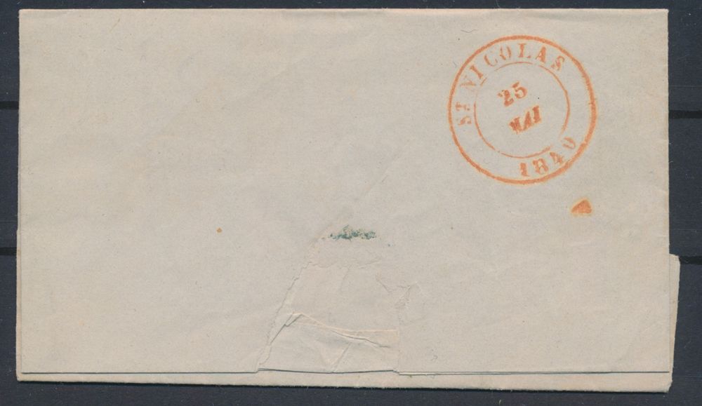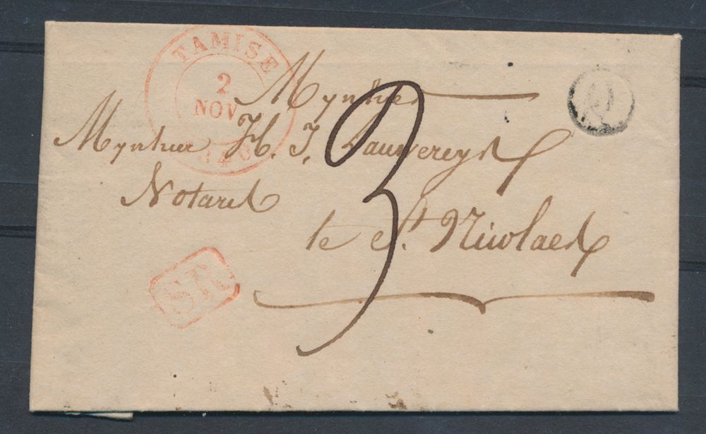 975 image1840 Forerunner with contents, from Tamise (Herlant 3), dated 2 November 1840, with post office box "Q" (Ruppelmonde) in black, to St.-Nicolas, "SR" cancellation in red frame, charge 3 decimes, including 1 deciem for rural delivery, vf(Image 1) (Image 2)