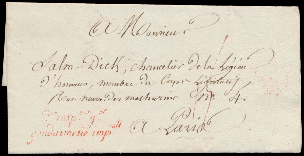 961 image1809 Forerunner without contents, official letter with free postage, to Paris. Cancellation in red "P.er insp.eur G.al gendarmerie imp.ale", addressed to Salm Dick, chancelier de la Légion d'Honneur, membre du Corps Legislatif, Place Neuve des Machurins n° 4 à Paris", rare, vf(Image 1) (Image 2)