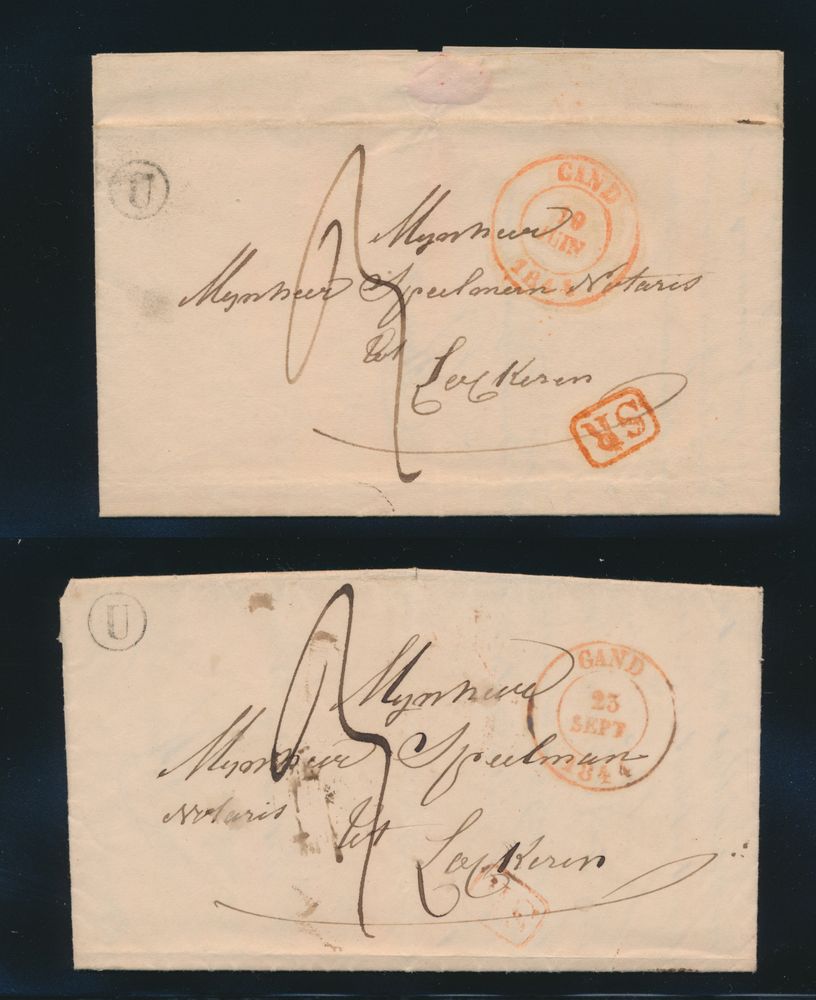 978 image4 forerunners, all with post office box and red cancellation "SR" in frame, Ghent (Post Office Box U - twice), Termonde (Post Office Box B), Sint-Niklaas (Post Office Box R), all to Lokeren, vf(Image 1) (Image 2)