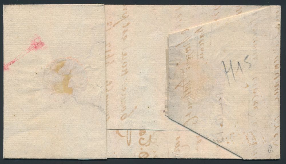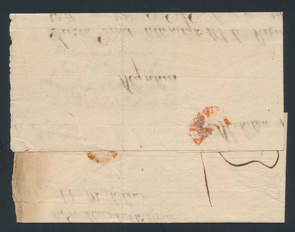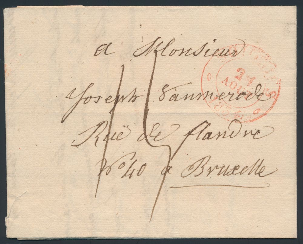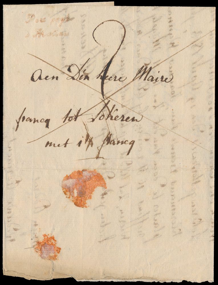 963 image1814 Forerunner with contents from Mechelen, Herlant 20 (Port Payé à Malines - red cancellation), with manuscript "Franco tot Lokeren - Met 1 1/2 francq", to Lokeren, this is one of the most difficult cancellations according to Herlant, vf(Image 1) (Image 2)