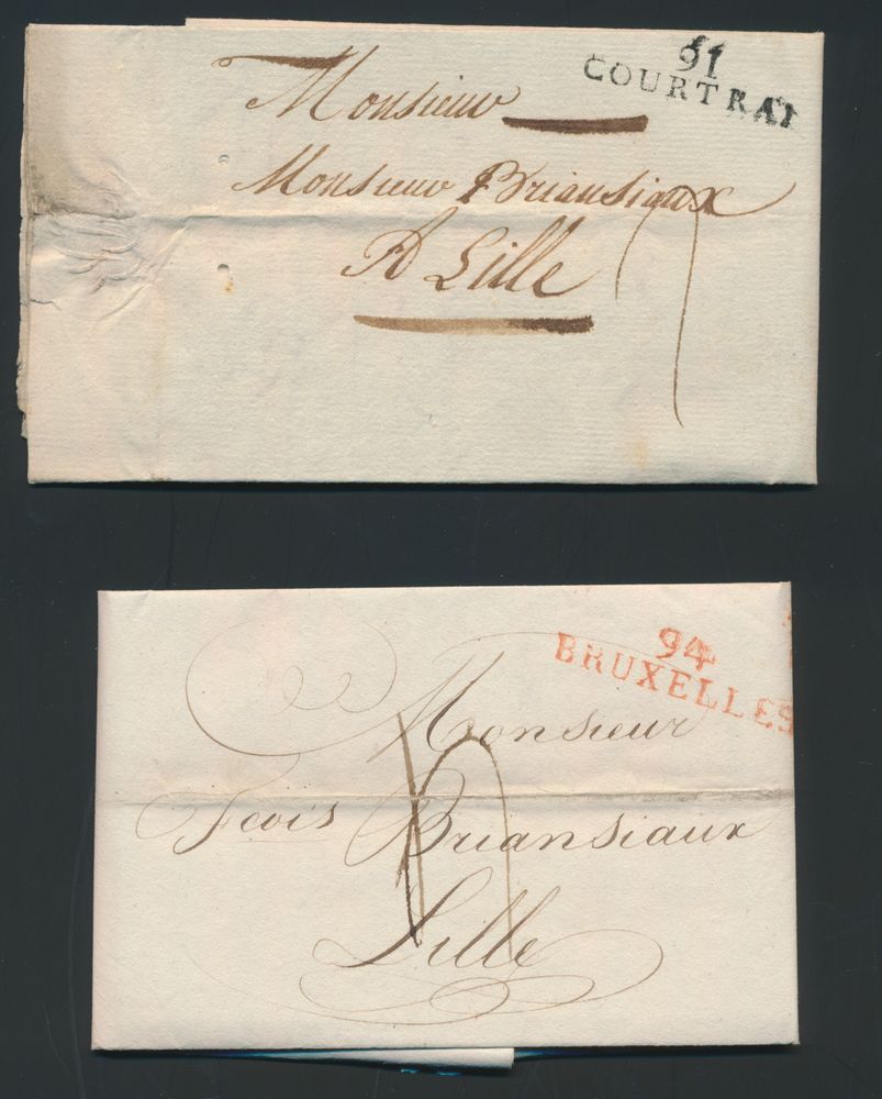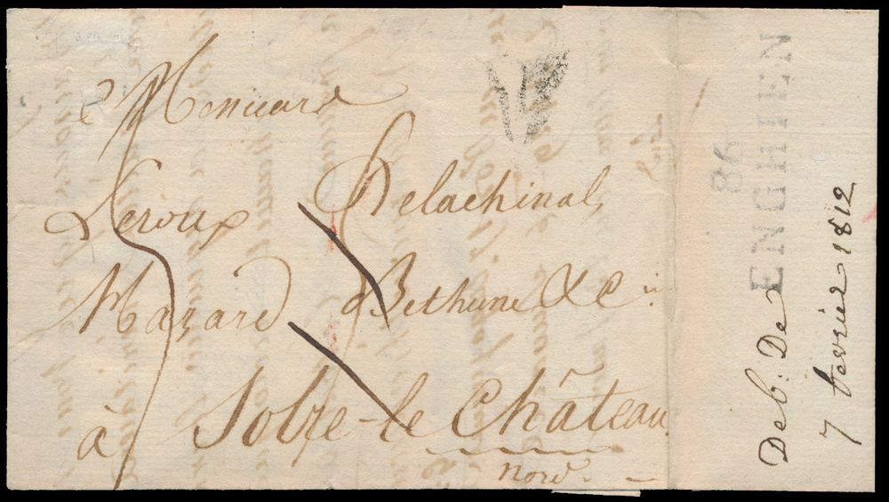 962 image1812 Forerunner with contents from Paris (France), dated 3 February 1812 to Solre le Château, incorrectly handled in Enghien. The postal clerk used the departure stamp Herlant 15, "86 Enghien", and added the text "Deb : De - 7 fevrier 1812" in manuscript, charge "5 decimen"; this cancellation is described in the Herlant book on page 135, unique item, vf(Image 1) (Image 2)