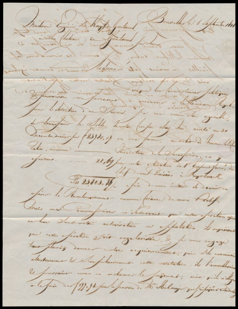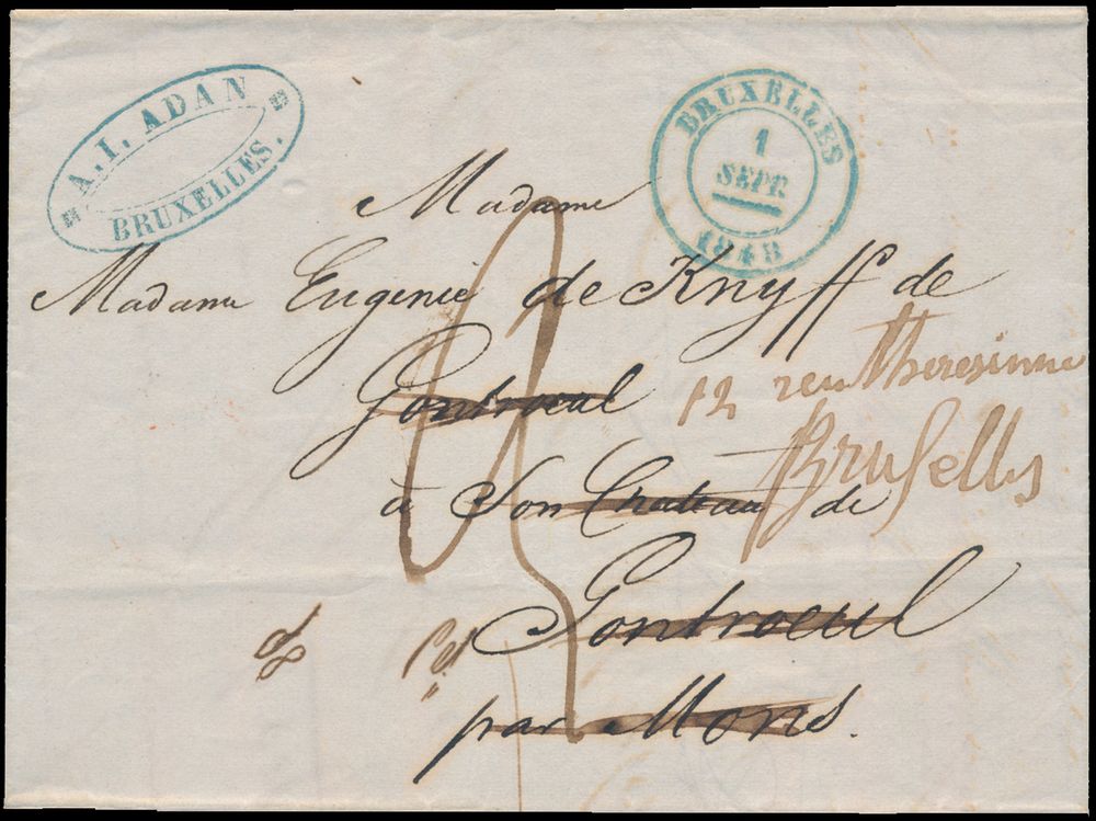 973 image1848 Forerunner without contents, from Brussels, dated 1 September 1848, to Gontreuil, arrival postmark Type 18 Givry, charge 3 decimes, returned to Brussels (Debourse Mons oval cancellation red), receipt cancellation is with holiday number, vf(Image 1) (Image 2) (Image 3)