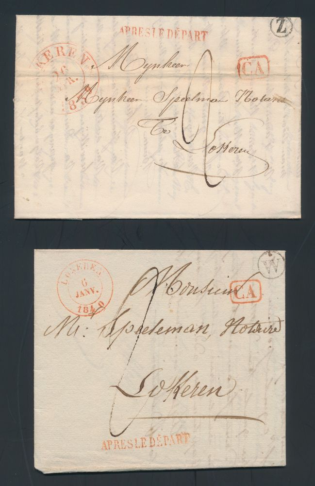 979 image2 forerunners, both with post office box and red cancellation "CA" in frame, Lokeren (Post Office Box W and Z), both with red cancellation "Après le Départ", all to Lokeren, vf(Image 1) (Image 2)