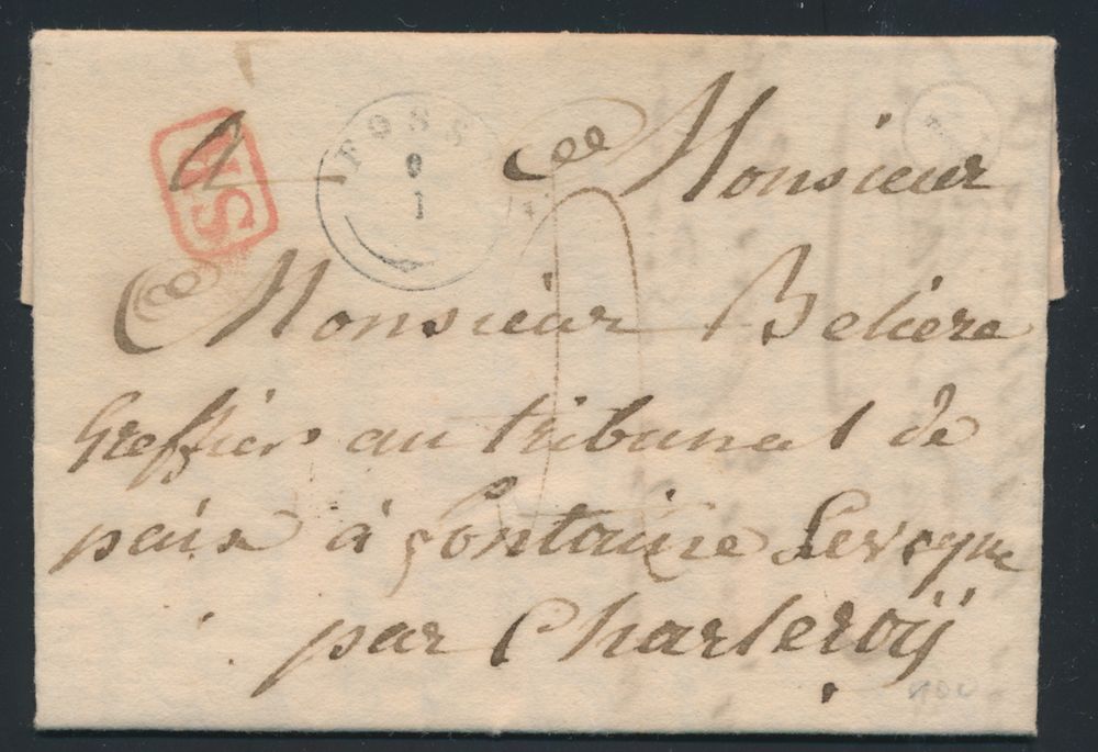 970 image1839 Forerunner with contents, from Fosse, (Type 18 cancellation, Herlant 1), very light post box mark, in circle black L (Lesve) as well as the letter heading is Lesve, nice cancellation in red frame "SR", with charge of 4 decimals, vf(Image 1) (Image 2)
