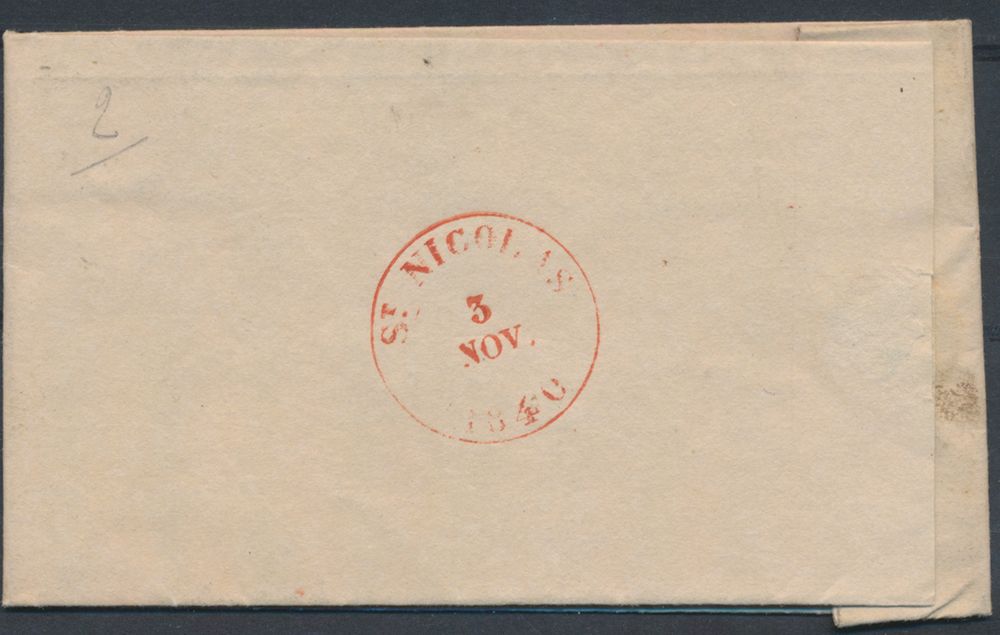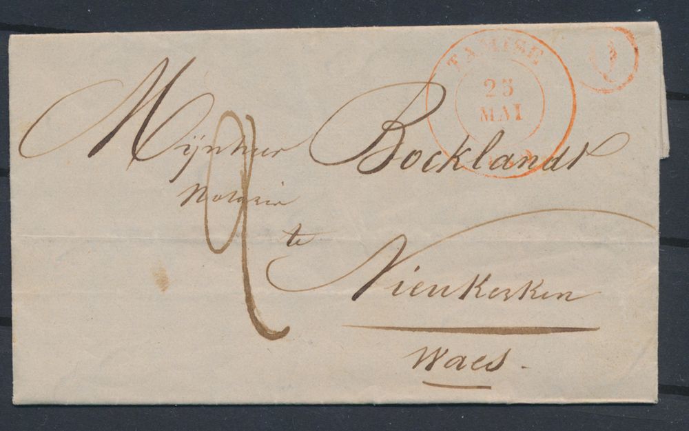 977 image1849 Forerunner with contents, from Tamise (Herlant 4), dated 25 May 1849, with post office box "Q" (Ruppelmonde) in red, to Nieuwkerken Waes (receipt mark "St. Nicolas"), charge 2 decimes, vf(Image 1) (Image 2)