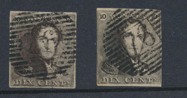 N° 1 "10c. brown" (2x) both fully margined, P.76-Louvain, vf