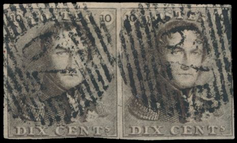 N° 1 "10c. brown" in pair, fully margined with cut in the