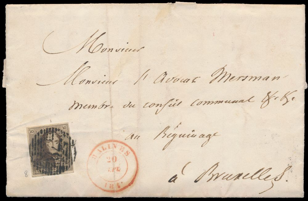 1134 image1849 N° 1 "10c. brown", fully margined, on letter, with cancel P.78-Malines, dated 20 September 1849, to Brussels, vf (OBP €220)(Image 1) (Image 2)