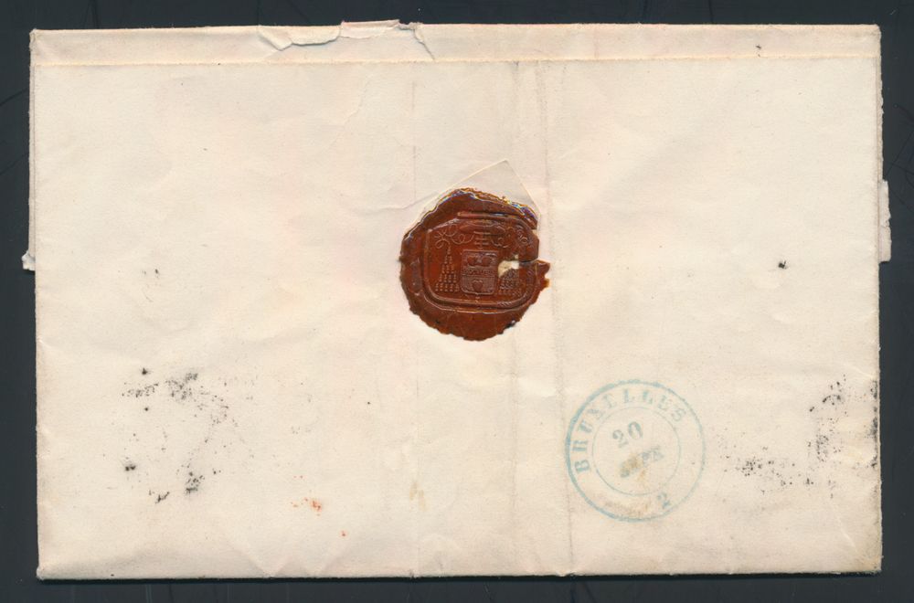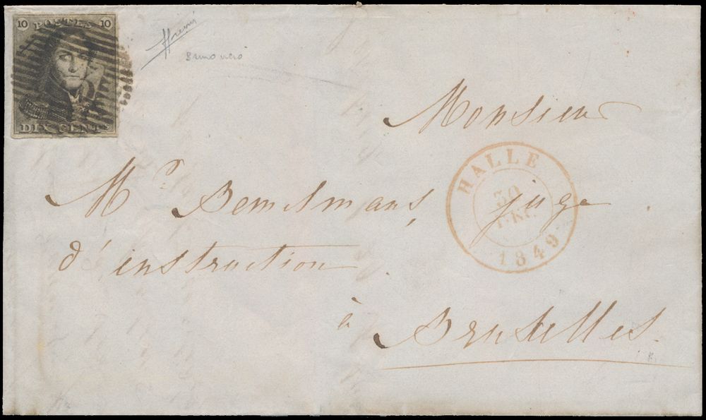1138 image1850 N° 1 "10c. brown", fully margined on letter without contents, cancel P.53-Halle, dated 20 February 1850, to Brussels, vf (OBP €220 + COBA €60)(Image 1) (Image 2)