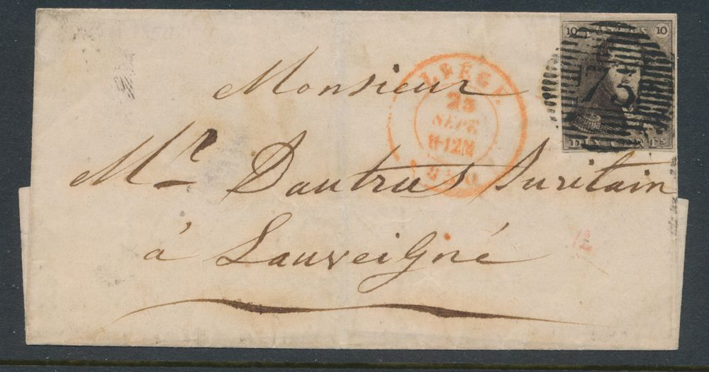 1139 image1850 N° 1 "10c. brown", on letter without content, fully margined, cancel P.73-Liège, dated 25 September 1850, to Louveigne with cancel Chaudfontaine, vf/f(Image 1)
