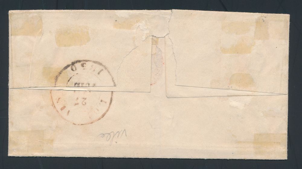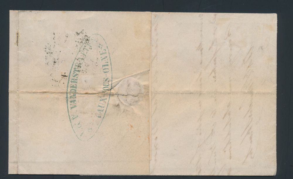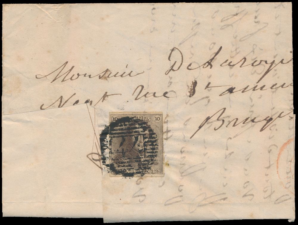 1133 image1849 N° 1 "10c. brown", on letter from Furnes, dated 16 October 1849, to Bruges, distance for this letter is more than 30 km, which requires "20c", 1 stamp cut away, remaining stamp is very nicely centrally cancelled and fully margined, f/to be checked (OBP €220 + COBA €40)(Image 1) (Image 2)