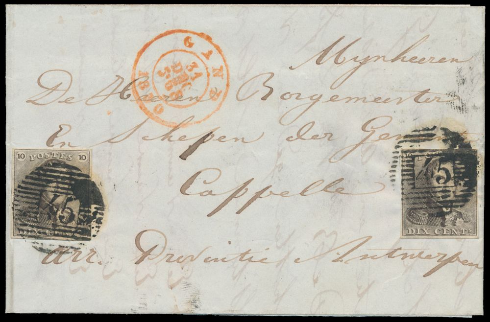 1137 image1850 N° 1 "10c brown", on letter with contents, two stamps: both fully margined, from P.45-Gand, dated 31 December 1850, to Cappelle (receipt mark Brasschaet, dated 1 January 1851), vf (OBP ++€220)(Image 1) (Image 2)
