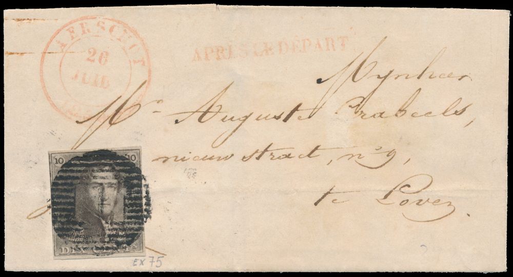1135 image1850 N° 1 "10c. brown", on letter without content, fully margined, beautiful central cancel P.1-Aerschot, dated 26 July 1850, to "Loven" (Leuven), vf, (OBP €220 + COBA €60)(Image 1) (Image 2)