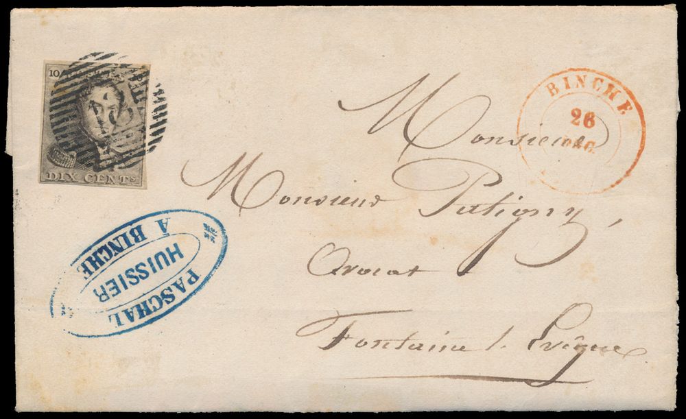 1132 image1849 N° 1 "10c. brown", fully margined on letter with contents, cancel P.18-Binche, dated 26 December 1849, to Fontaine L-Eveque, vf (OBP €220 + COBA €20)(Image 1) (Image 2)