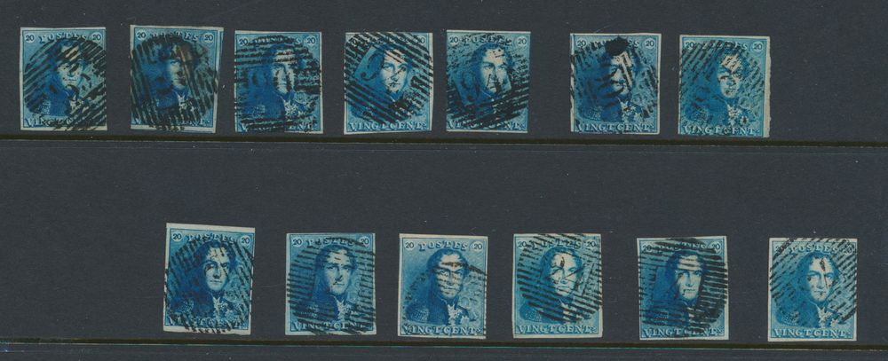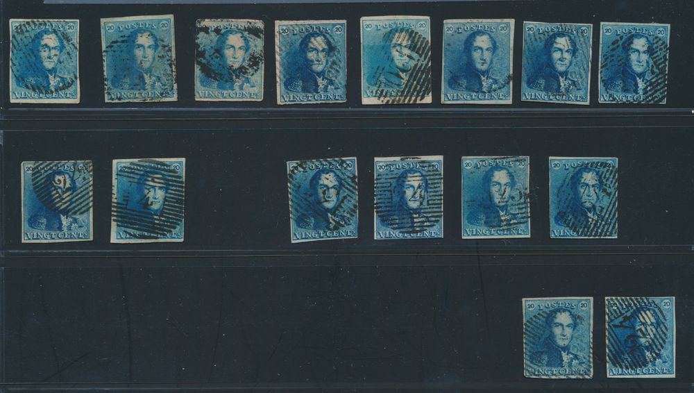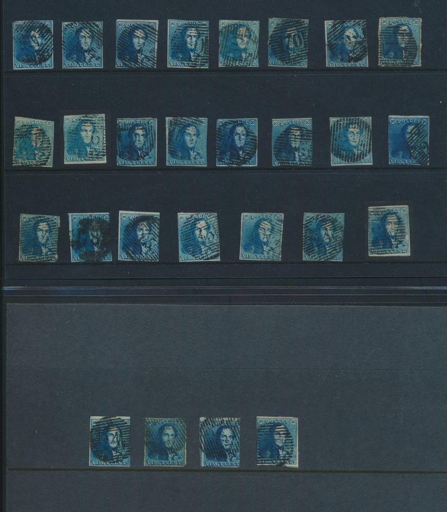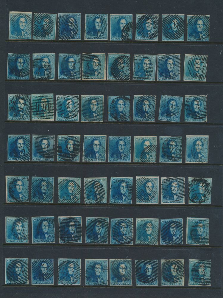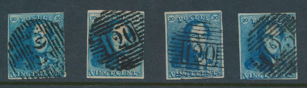 1184 0 imageN° 2A "20c. blue" (4x), all fully margined, cancels P.25, P.120 (thick and thin lines) and P.123, vf (OBP €240)(Image 1)