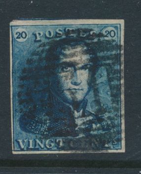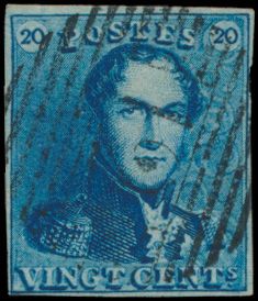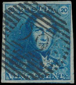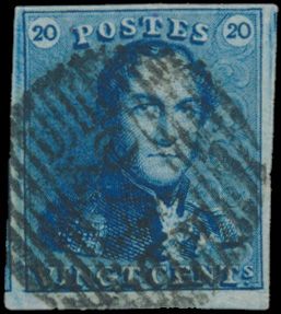 1187 0 imageN° 2A "20c. blue", fully margined, beautiful colour shade, cancel P.27-Chimay (heavy cancellation), griffes in the right 20 and in the bottom margin, vf (OBP €60 + COBA 50)(Image 1)