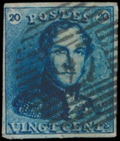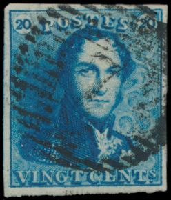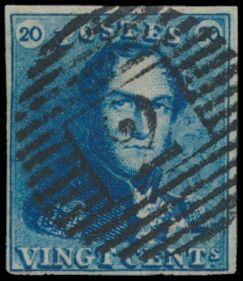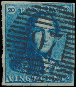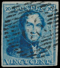 1199 0 imageN° 2A "20c. blue", fully margined with left and right neighbours, cancel P.24-Brussels, position 8, vf (OBP +€60)(Image 1)
