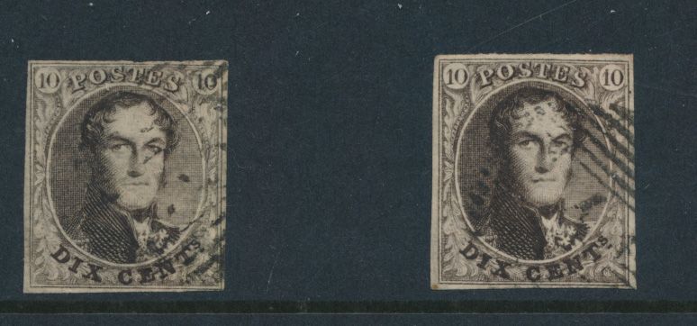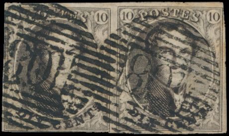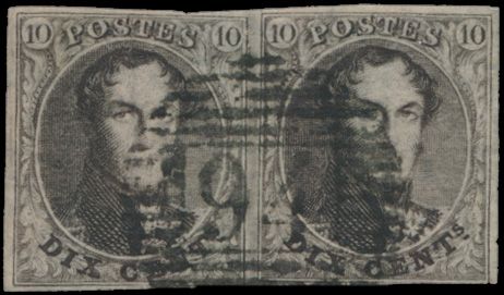 1325 0 imageN° 3 "10c. brown", fully margined with complete right neighbour, cancel P.85-Namur, beautiful griffes in the upper margin, vf (OBP €115)(Image 1)