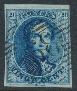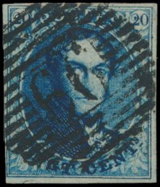 1340 0 imageN° 4 "20c. blue", fully margined, with central cancel P.66-Jodoigne, vf (OBP €70 + COBA €20)(Image 1)