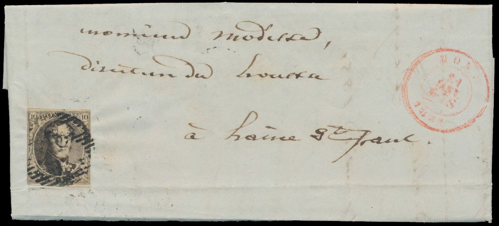 1332 image1851 N° 3 "10c. brown", fully margined, letter with contents, dated 21 January 1851, cancelled P.83-Mons, to Haine-St.-Paul (arrival postmark "La Louvière"), vf (OBP €200)(Image 1) (Image 2)