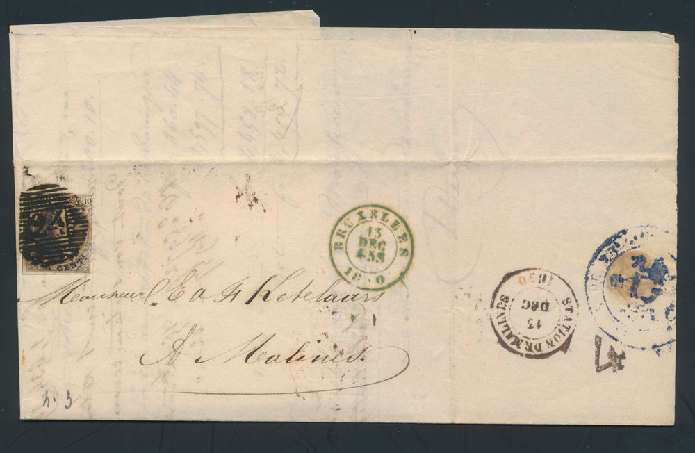 1330 image1850 N° 3 "10c. brown", cut on the right, on letter from Brussels P.24, dated 13 December 1850, to Malines, with nice receipt mark "Station de Malines", vf/f(Image 1)