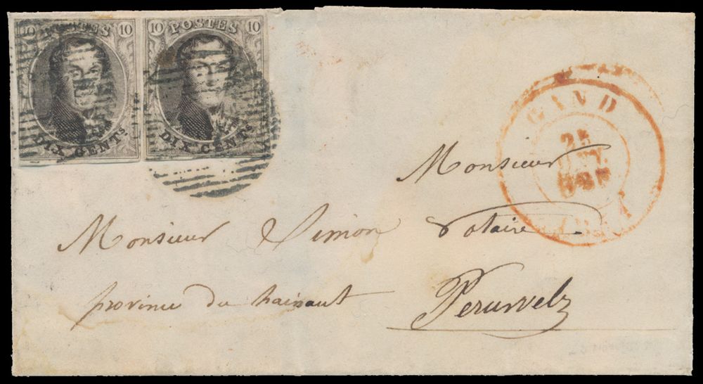 1331 image1851 N° 3 "10c. brown", 2 copies, fully margined, letter without content, dated 26 January 1851, cancel P.45-Gand, to Peruwelz, vf (OBP +€200)(Image 1) (Image 2)