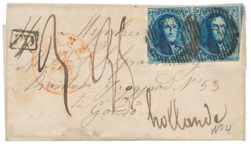 1345 image1852 N° 4, "20c blue", pair on letter without content, letter to the Netherlands from before the convention of 17 December 1851, in force 1 April 1852, cancel P.45-Gand, dated 17 December 1850, to Gouda (Netherlands), "PD" in black box, border office has crossed out the "PD" and charged 3 decimes postage, with manuscript "hollande", stamps have no value for letters to the Netherlands before the convention, exceptional letter, especially with medallion stamps, beautiful, vf - see photo cover(Image 1) (Image 2)