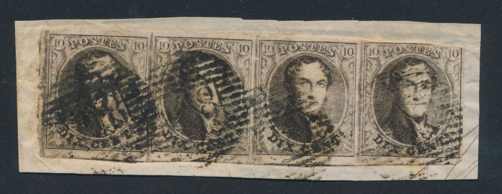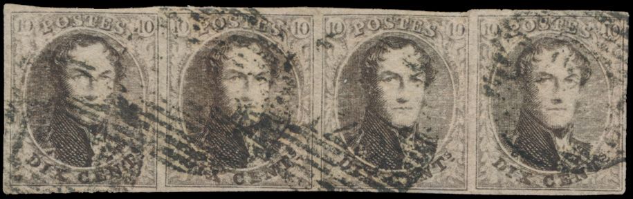 1375 0 imageN° 6 "10c. brown", in strip of 4, 3 stamps fully margined with neighbours and many griffes, including horizontal extension of the frame line, vf (OBP ++€150)(Image 1)