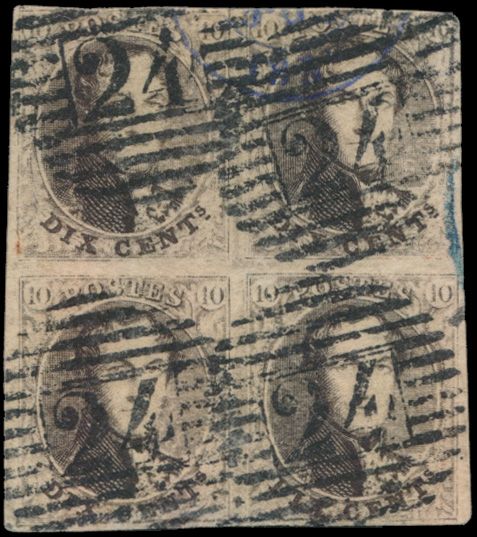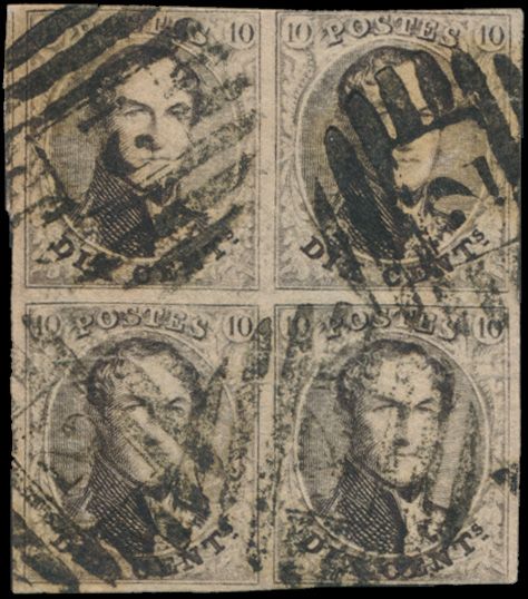 1368 0 imageN° 6 "10c. brown", block of four - touched at top, with cancel P.24-Bruxelles (14 bars), plate IV, position 123-124/133-134, vf/f (OBP -€300)(Image 1)