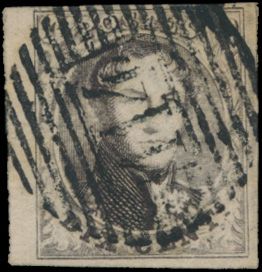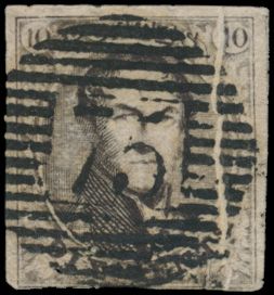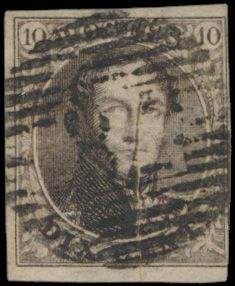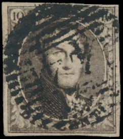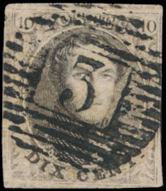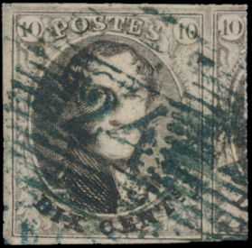 1377 0 imageN° 6 "10c. brown", fully margined with very large right neighbour, with GREEN cancel P.24-Brussels (18 bars), beautiful, vf(Image 1)