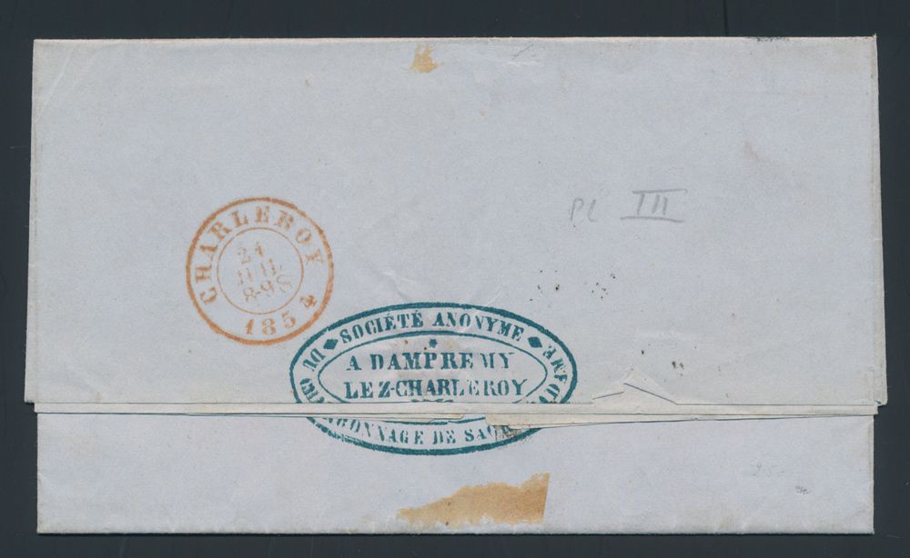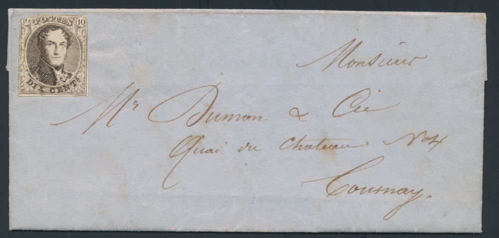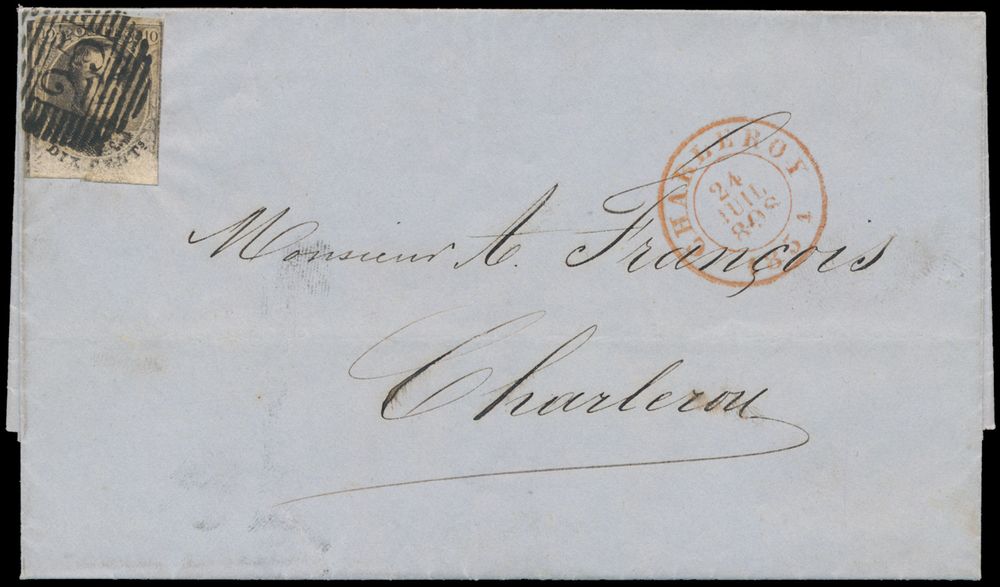 1366 image1854, n° 6-Cu "10c. brown", on letter with contents, cancel P.25-Charleroi, dated 24 July 1854, to Charleroi, plate III, with curiosity "missing printing at the bottom", vf(Image 1) (Image 2)