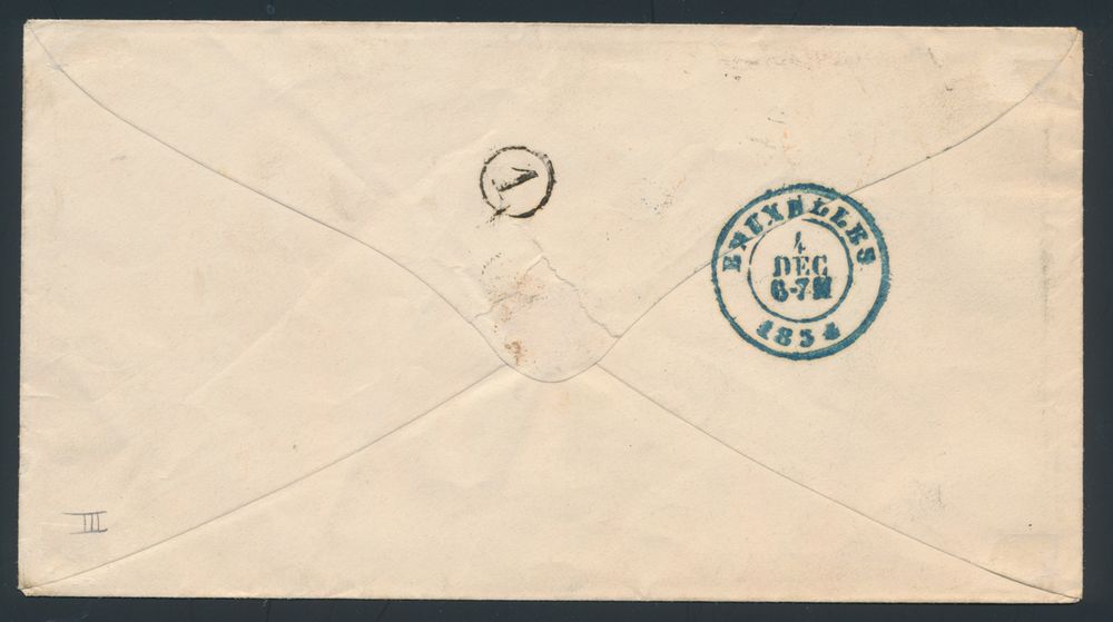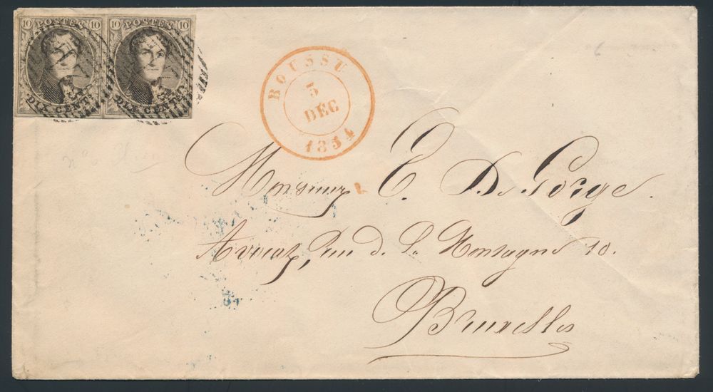 1380 image1854 N° 6 "10c. brown", in pair on cover, fully margined, plate III, cancel P.21-Boussu, dated 3 December 1854, to Brussels, nice postman's stamp on reverse, 1 in circle black, vf(Image 1) (Image 2)