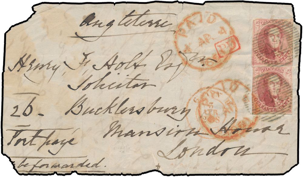1362 image1850 N° 5 "40c. carmine pink", 2x w.o. 1 fully margined on letter part (not in good condition), second weight class ("80c." charge) from Gand, dated 3 April 1850, to London, "PD" in red frame, f/to be checked (OBP -€1,100)(Image 1) (Image 2)