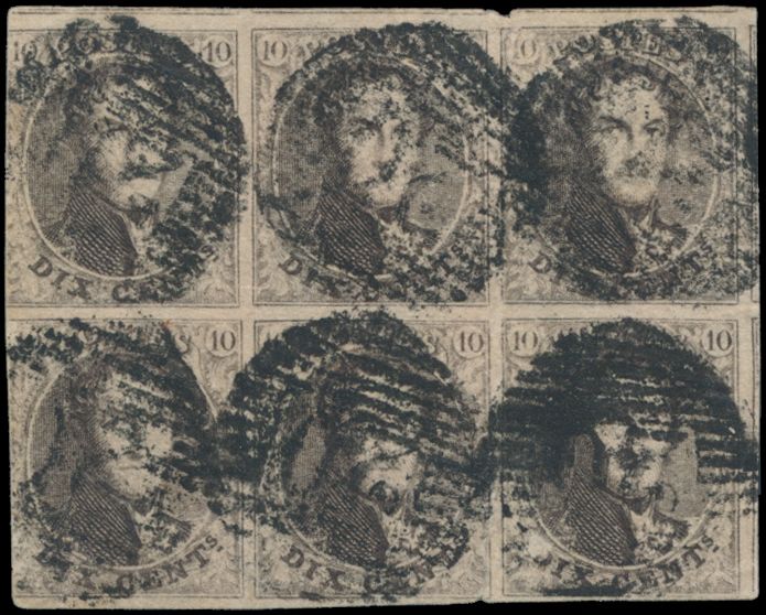 1367 0 imageN° 6 "10c. brown" in block of four, touched at bottom right, with cancel P.2-Alost (8 bars), plate VI, position 146-147/156-157, vf/f (OBP -€300)(Image 1)