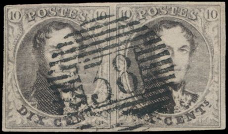 1369 0 imageN° 6 "10c. brown", in pair, fully margined, cancel P.38-Enghien, only 1 cancellation on both stamps, vf(Image 1)