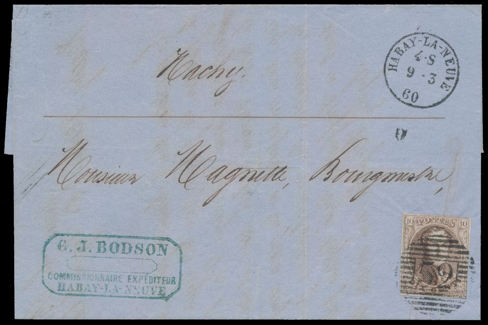 1457 image1860 N° 10A "10c. brown", fully margined, on letter from P.52-Habay-la-Neuve, dated 9 March 1860, to Hachy (same postal district, so no arrival postmark on back), special feature of this cancellation is the Habay cancellation without "E", beautiful cancellation, vf(Image 1) (Image 2)