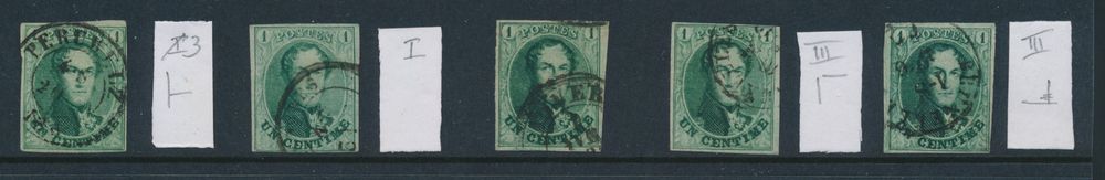 1450 0 imageN° 9 "1c. green" (5x) fully margined, with multiple griffes, plating, one with cancel Peruwelz, vf (OBP €700)(Image 1)