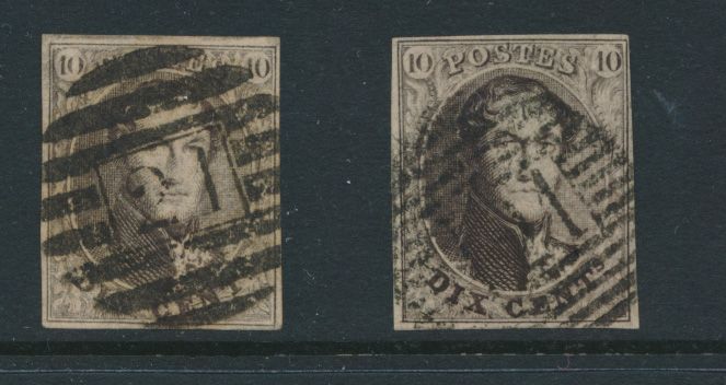 1453 0 imageN° 10A "10c. brown" (2x), fully margined, both cancelled P.21-Boussu, both 8 and 17 bars, vf(Image 1)