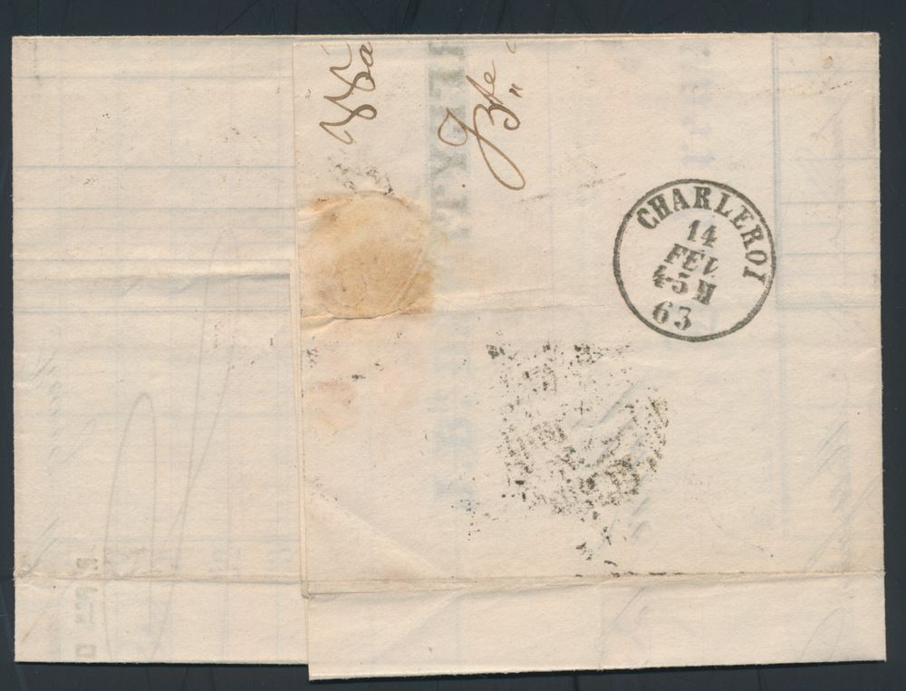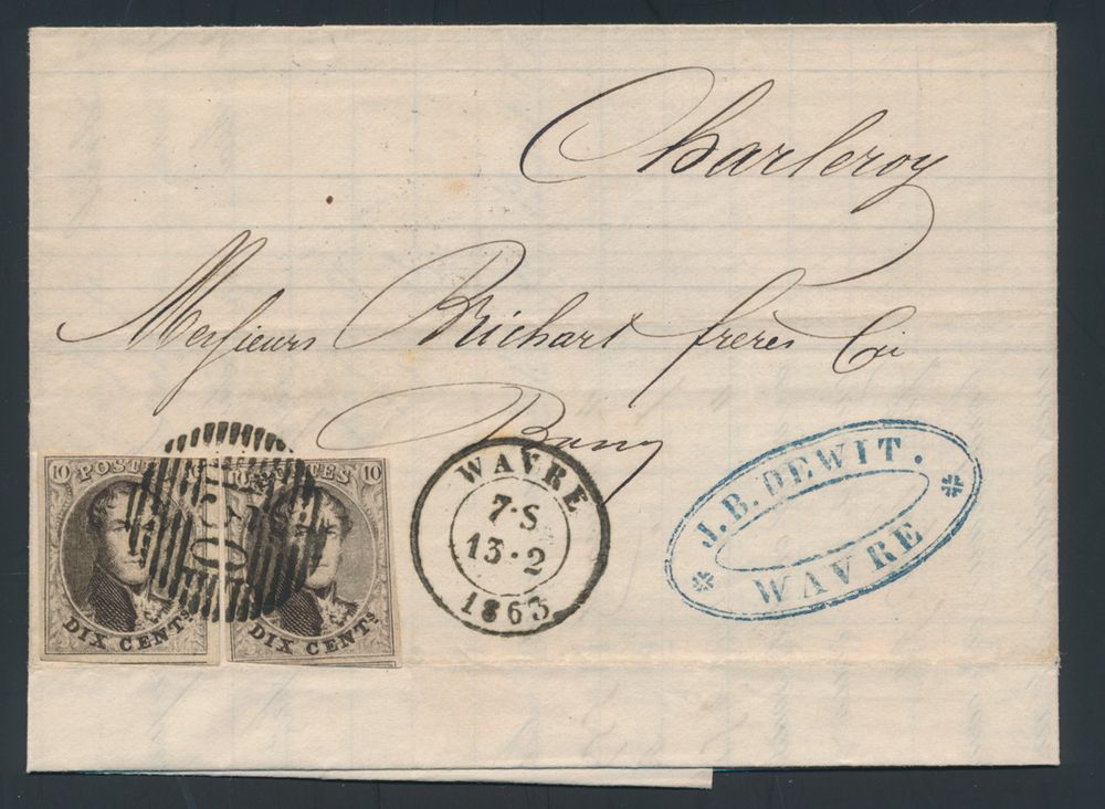 1458 image1863 N° 10 "10c. brown" (2x) on letter with contents, both slightly touched at top right, multiple neighbours, cancelled P.130-Wavre, 1 cancellation invalidating both stamps (not conforming), dated 13 February 1863 to Charleroi, vf/f(Image 1) (Image 2)