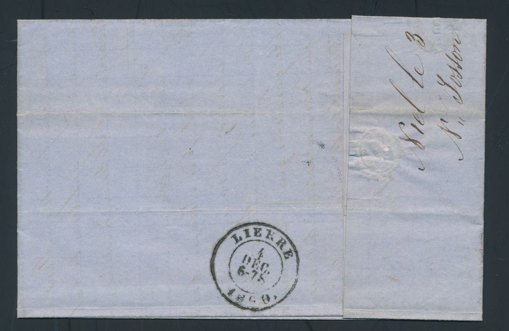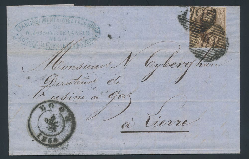 1456 image1860 N° 10 "10c. brown", fully margined on letter, cancelled P.19-Boom, dated 3 December 1860, to Lierre, stamp is cancelled twice, letterhead is Niel, vf(Image 1) (Image 2)