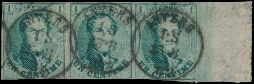 1447 0 imageN° 9 "1c. green", in strip of 3 with very large right margin, slightly cut on two places at the bottom, cancel "Anvers", dated 23 8 62, vf/f (OBP -€500)(Image 1)