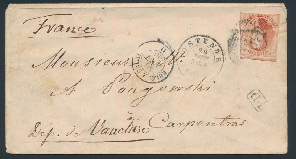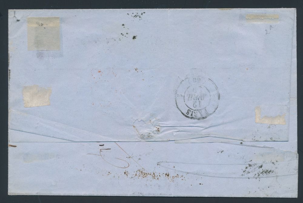 1484 image1860 N° 12A "40c. carmine" with upper neighbour (but cut on other sides), from P.90 Ostend, to France 29 August 1860, "PD" in black frame with transit stamp Calais, f/to be checked (OBP € 120 + COBA €10)(Image 1) (Image 2)